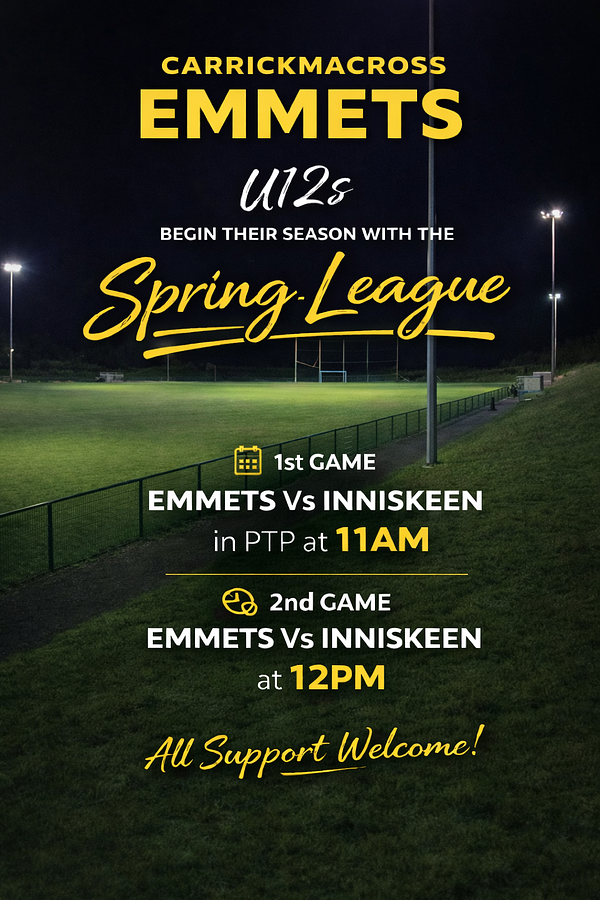 Best of luck to our Carrickmacross Emmets U12s as they begin their Spring League tomorrow 💚💛